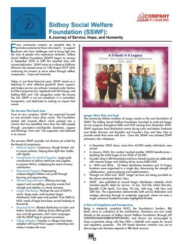 20 Sidboy Social Welfare Foundation (SSWF):A Journey of Service, Hope, and HumanityEvery community contains an essential duty to provide assistance to those who need it , to support those who face challenges and to bring light into the lives of people who experience darkness. Sidboy Social Welfare Foundation (SSWF) began its mission in September 2022 to fulfil this essential duty with sincere dedication. SSWF exists as a tribute to Siddhant Dhawan who passed away on 16th August 2019 while continuing his mission to serve others through selfless compassion , hope and humanity.Today, in just three financial years, SSWF stands as a testimony to what collective goodwill, donor support, and tireless service can achieve. Licensed under Section 8 of the Companies Act, registered with Niti Aayog, and holding 80G and 12A recognition under the Income Tax Act, SSWF is not just compliant%u2014it is committed, transparent, and dedicated to making an impact that counts.The Services That Touch LivesFrom its very inception, SSWF has remained focused on one principle: every drop counts. The Foundation started with minimal efforts which evolved into a mission that has benefited more than five lakh people through , promoters%u2019s zeal besides donations , support and blessings from over 150 supporters who believed in its mission.The services SSWF provides are diverse yet united by the thread of compassion:%u2022 Medical Support: Continuous, though limited, aid to cancer patients, helping them fight their battles with dignity.%u2022 Coordination for Medical Supplies: Large-scale coordination to deliver medicines and supplies to partner NGOs, multiplying the reach of every contribution.%u2022 Educational Support: Empowering underprivileged children and youth through learning and opportunities.%u2022 Women Empowerment: Offering marriage support and counselling, ensuring women find strength and stability in critical moments.%u2022 Langar Distribution: Perhaps the soul of SSWF%u2019s work%u2014large-scale, multi-location langar distribution, both open and packed. From Delhi to NCR, meals of hope have been served tirelessly to thousands.%u2022 Seasonal Drives: Blanket distribution on Lohri and Makar Sankranti, clothing drives offering both new and old garments, and T-shirt campaigns with the SSWF logo to spread awareness.%u2022 Village Adoption: Families in villages have been adopted with local NGO support, extending care where it matters the most.Langar: More Than Just FoodThe community kitchen tradition of Langar stands as the core foundation of SSWF. The Sidboy Social Welfare Foundation launched its multi-site langar service program throughout Delhi and NCR starting from December 2022. SSWF organizes food distribution events during Lohri and Makar Sankranti and Maha Shivratri and Baisakhi and Founder%u2019s Day and New Year to provide meals that come with love. Once this SEWA was initiated SSWF achieved a few milestones:%u2022 In December 2022 alone, more than 45,000 needy individuals were served.%u2022 In January 2023, this number touched another 50000 beneficiaries%u2014doubling the initial target of Jan 2023 of 25,000.%u2022 Founder%u2019s Day (14th November) and Guru Nanak Jayanti are celebrated with massive langar and clothing drives across Delhi-NCR.%u2022 In 2023 and 2024 , 23 kheer distribution locations and 10 langar locations were organized in a single day, showcasing the strength of collaboration , precise playing and implementation. %u2022 Through out 2024 and 2025 langar services are being provided on the above mentioned dates/ days. %u2022 SSWF also published its annual langar distribution schedule which included specific dates for service: 1st Jan, 2nd Feb, Maha Shivratri, Baisakhi (13th April), 31st May, 7th July, 16th Aug, 14th Nov, and 20th Dec. The organization demonstrates both service dedication and strategic planning through its systematic approach where not even a single untoward incident has been highlighted till date. A Story of Compliance and TransparencyBeing a statutorily complaint NGO, the Foundation%u2019s bankers, RBL Bank, serve as custodians of the contributions. Donations are now made directly to the account of Sidboy Social Welfare Foundation (through UPI SAPANDHAWAN38@OKHDFCBANK), and donors are encouraged to share screenshots along with their PAN + ADAAR card copies for record and regulatory purposes. The UPI based donation initiative was just to discourage cash donation deposits in RBL Bank account.
