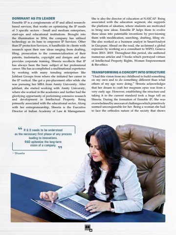 24 DOMINANT AS ITS LEADEREnnoble IP is a conglomerate of IP and allied researchbased services, that works on optimizing the IP needs of 3 specific sectors - Small and medium enterprises, start-ups and educational institutions. Brought into the illumination in 2014, the company has utilized technology as its base to empower IP Services. Other than IP protection Services, it handholds its clients with research upon their raw ideas ranging from drafting, filing, prosecution to the commercialization of their patents, trademarks, copyright and designs and also provides corporate training. Shweta recollects that IP has always been the basic subject of her professional career. She has accomplished a multinational experience by working with many trending enterprises like Jubilant Groups from where she initiated her career in the IP vertical. She got a pre-placement offer while she was pursuing her MBA from Amity University. After jubilant, she started working with Amity University, where she worked in the academics and further had the glorifying opportunity of performing extensive research and development in Intellectual Property. Being primarily associated with the educational sector, Along with her entrepreneurship, Shweta is the Executive Director of Indian Academy of Law & Management. She is also the director of education at NASCAP. Being associated with the education segment, she supports the platform of ideation, where students are motivated to bring new ideas. Ennoble IP helps them to evolve these ideas into patentable inventions by provisioning them with modification, searching, drafting, filing etc. She also worked as a business analyst in SmartAnalyst in Gurgram. Ahead on the road, she acclaimed a global exposure by working as a consultant to WIPO, Geneva from 2013- 2019. Throughout this period, she authored numerous articles and 3 books which portrayed virtues of Intellectual Property Rights, Women Empowerment & Bio-ethics. TRANSFORMING A CONCEPT INTO STRUCTURE%u201cI had this vision from my childhood to build something on my own and to do something different than what others of my age were doing,%u201d Shweta acknowledges that her dream to craft her magnum opus was from a very early age. However, establishing the structure and taking it to the current standard took a huge toll on Shweta. During the formation of Ennoble IP, She was overwhelmed by anocean of challenges which primitively seemed unconquerable for her. Being a woman she had to face the orthodox nature of the society that shows R & D needs to be understood as the necessary first phase of any process leading to innovations. R&D epitomize the long-term vision of a company. - Shweta%u201c%u201c24