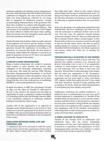 25numerous prejudices for aspiring women entrepreneurs. Secondly, while attending one of the Intellectual Property conferences in Singapore, she came across the fact that India was being intensively criticized for not being able to safeguard its intellectual property. Despite accommodating cultivated brains of the generation who show their excellence in working with intangible assets, India was not able to show its optimal efficiency. This was because of an undefined framework, which lagged the nation behind in Global Innovation Index ranking. These two factors were the immediate reasons that laid down the foundation of Ennoble IP. During the time of its inception, India was quite unaware of the emphasis of IP services and the treasure it holds. This oblivious mindset also proffered unwillingness and ignorance towards the significance of investing in IP protection. To overcome this hassle, the firm formed a framework, which helped the company to provision ace grade IP protection services at 75% lower cost thanwhat is generally charged in the market.A ONE-OF-A-KIND ORGANISATIONBeing a woman entrepreneur she wanted to empower other women to come forward and portray their willingness to be financially independent, especially in rural areas. This made her innovate WIEF (Women Innovation Entrepreneurship Foundation). A non-Profit organization that gives women the platform, where they can implement their ideas to earn profits out of them. Along with this, she is also in the process of establishing SHEREAL, a tech-media platform for women. In-depth investment on R&D has promisingly brought an edge over the others for Ennoble IP. Innovation is the key to stay ahead in the domain and also helps an organization to create a competitive mindset. Ennoble IP is a technology-driven firm and through intensive R&D, it has consistently enhanced its technology platform making it convenient for clients%u2019 usage. Another USP of this organization is its approach to takingthe newly initiated business to the next level. They endeavour to provide appropriate IP protection services to MSMEs, Start-ups and educational institutions that can boost their economiesand contribute to the development of the country.EQUALIZING BETWEEN WORK LIFE AND PERSONAL LIFE %u201cI understood that to be successful in both the arenas doesn%u2019t mean I need to have equal hours at home and in the office, rather it means that I need to find a rhythm that fulfils both sides.%u201d Based on this content, Shweta acknowledges that having an entrepreneurial career can disrupt the balance between professional and personal life. But these disruptive circumstances can be mitigated by following an organized pattern that can synchronize both.In her case, she keeps a very enthusiastic mindset towards herbrainchild. She loves challenges and starts her day with the motivation to withstand all that comes in her way. Over the years, the approach towards business women has changed. However, there are still people who like to constrict women within a societal dogma. To this, Shweta believes that every woman in society has the right to lead her life like others. Hence, she feels no guilt in making mistakes in contrast to societal expectations. To streamline both the hemispheres, she utilizes experiences and lessons, which also helps her in meeting her expectations.TECHNOLOGICALLY ELEVATED TO THE TRENDSTechnology is a platform which evolves with time. The platform also enables customers to be advanced and procure fascinating ways to use it. If an organization continues to resist progress and decides not to keep up with technology, they are likely to fade away into obscurity. Shweta believes that technology is the turnkey that has taken her organization to the stratosphere. The whole world is steadily becoming technologically augmented and has given birth to many innovations (PCs, laptops, tablets and mobile devices).To stay adept with these transitions, Ennoble IP keeps updating itself according to the needs, which also helps theorganization in anticipating long term stability and growth.Furthermore, technology has enabled mankind to establish all sorts of communication at every level and it becomes important to comprehend to it. Ennoble IP has installed all the advancements to ensure smooth communication with their clients so that prospective opportunities don%u2019t leave unchecked. Along with this, the company ensures that every employee in the company is equipped and enlightened with all the installed customizations, which helps them to tailor satisfying services to their customers and keeps them competitive.A WORK CULTURE TO LOOK UP TOEnnoble IP has brought forth an enthusiastic and intellectual team, who has shown indomitable performance over the years. Each employee in the team is termed as a cornerstone of the organization. As such, management makes sure that every employee is valued as an individual, and given equal and enough 25