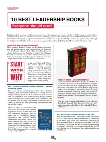 28 10 BEST LEADERSHIP BOOKSReading books is a necessary skill that one needs to have. In particular, one who is a founder or CEO or wants to see themselves in a top-notch position as a better leader. Because, ultimately, you can%u2019t make all mistakes in life and learn from them. You have to learn from other people%u2019s experiences in their lives (whether bad or good and both), and the best way to do that is through reading thier published books. So, to see you as a good leader, we have picked up the 10 best leadership books to read.START WITH WHY - AUTHOR SIMON SINEKHave your ever thought? Why do very few leaders, products, and originations leave a great impression on us? There are very few leaders influence their followers and employees to stick with them forever. Thinking of leaders like Mahatma Gandhi or companies like Apple, Harley Davidson, CocaCola, etc. These leaders and companies started movements. They have incredible loyal followers and customers.In the book %u201cStart with Why%u201d, the author (Simon Sinek) explains a naturally occurring pattern, a way of thinking, acting, and communicating that gives some leaders the ability to inspire those around them. The author believes, those who start with %u201cWhy%u201d never manipulate people. Instead, they inspire. THE 7 HABITS OF HIGHLY EFFECTIVE PEOPLE %u2013 AUTHOR STEPHEN R. COVEYThis is one of the bestselling books that offers a holistic, integrated, principal-centered approach to solving personal and professional problems. It is written based on Covey%u2019s own life experiences with others learning things gathered while working with successful individuals in business and universities and studying multi-different literature on the concept of success and many psychology books (written over the past 200 years.).The book opens a conversation with how many individuals who achieved magnificent success in their lives still find themselves struggling with an inner need for developing personal effectiveness and growing healthy relationships with other people. The author believes the way we see the world is completely based on our own perceptions. In order to change a given situation, we must change ourselves first. And to change ourselves, we must change our perceptions.TOOLS OF TITANS %u2013 AUTHOR TIM FERRISSTools of Titans is the tactics, beliefs, and habits of world-class performers, written by Tim Ferris. Imagine if you can learn from over 200 top performers all over the world. The author did exactly that on his podcast %u201cThe Tim Ferriss Show%u201d, which has over a hundred million downloads, featuring guests such as movie stars, pro athletes, hedge fund managers, billionaires, motivational speakers, entrepreneurs, and so on and so forth.Tim has gone far ahead and distilled all the valuable knowledge from all these interviews that he%u2019s had. And compartmentalized it into this book called %u201cTools of Titans%u201d. THE FIRST 90 DAYS %u2013 AUTHOR MICHAEL D WATKINSNew professionals are very vulnerable in their first month in a job. This is because they have less in-depth knowledge of the issues they%u2019ll face and insufficient knowledge of what they need to do to make a success of their new role. According to the author, if a new one (who has just joined a company) is not able to create momentum in the first 90 days, then the rest of their time in that position would be an uphill battle.Everyone should readEducation