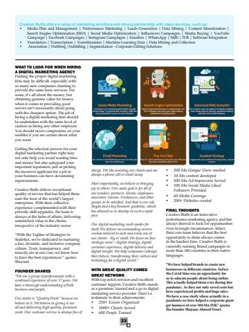 33Creative Buffs offers a range of marketing solutions and strong partnership with many services, such as:%u2022 Media Plan and Management | Performance Marketing | Leads Generation | Data Mining | Content Monetization | Search Engine Optimization (SEO) | Social Media Optimization | Influencers Campaigns | Media Buying | YouTube Campaign | Facebook Campaigns | Instagram Campaigns | Emailers | WhatsApp | SMS | IVR | Software Integration%u2022 Translation | Transcription | Transliteration | Machine Learning Data | Data Mining and Collection%u2022 Annotation | Dubbing |Subtitling | Segmentation - Corporate Gifting SolutionsWHAT TO LOOK FOR WHEN HIRING A DIGITAL MARKETING AGENCYFinding the proper digital marketing firm may be difficult, especially with so many new companies claiming to provide the same basic services. For some, it%u2019s all about the money, but obtaining genuine value for money when it comes to providing good service isn%u2019t necessarily about going with the cheapest option. The job of hiring a digital marketing firm should be undertaken with the same level of caution as hiring any other employee. You should never compromise on your wishlist if you are certain about what you want. Getting the selection process for your digital marketing partner right may not only help you avoid wasting time and money but also safeguard your important reputation, just as picking the incorrect applicant for a job in your business can have devastating repercussions.Creative Buffs deliver exceptional quality of service that has helped them earn the trust of the world%u2019s largest enterprises. With their collective experience complemented with their periodic skill upgrades, the team is always at the helm of affairs, delivering unmatched value to the clients, irrespective of the industry sector. %u201cWith the Tagline of Strategies to Statistics, we%u2019re dedicated to nurturing a fun, dynamic, and inclusive company culture. Trust, transparency, and tenacity are at our core; we know how to have the best experiences.%u201d quotes ShayaanFOUNDER SHARES %u201cWe are a group of professionals with a combined experience of over 17 years. We have a thorough understanding of both business and people. Our motto is %u201cQuality Work%u201d because we believe in it. We believe in giving it our all and delivering high-quality, premium work. Our customer service is always free of charge. We like assisting our clients and are always a phone call or email away. Most importantly, we believe in bringing joy to others. Our main goal is for all of our vendors, partners, clients, employees, associates, interns, Freelancers, and other groups to be satisfied. And that is our sole slogan and a key business guideline, which has allowed us to develop at such a rapid pace.Our digital marketing work speaks for itself. We deliver an outstanding service custom-tailored to each and every one of our clients - big or small. We focus on four strategic areas %u2013 digital strategy, digital customer experience, digital delivery and digital insight. We help companies redesign their future, transforming their culture and technology for a digital world.%u201d WITH GREAT QUALITY COMES GREAT NETWORKWith top notch services and excellent customer support, Creative Buffs stands as a premiere, trusted and a go to digital marketing service provider. Here%u2019s a testimony to their achievements: %u2022 250+ Events Organized%u2022 1000+ Clients Served%u2022 600 People Trained%u2022 200 Mn Unique Users reached%u2022 10 Mn content developed%u2022 500 Mn Ad Impression Served%u2022 100 Mn Social Media Likes/ Followers Provided.%u2022 60 Media Coverage%u2022 200+ Websites createdFINAL THOUGHTS Creative Buffs is an innovative performance marketing agency and has always thrived to look for opportunities even in tough circumstances. Infact, their core team believes that the best opportunity to shine always comes in the hardest time. Creative Buffs is currently running Brand campaigns in more than 180 countries in their native languages. %u201cWe have helped brands to create new businesses in different countries. InFact the Covid time was an opportunity for us to educate people about being online. This actually helped them a lot during this pandemic. As they not only saved costs but have experienced profits and huge sales. We have a case study where actually in a pandemic we have helped a corporate giant get business of over 500 Mn INR.%u201d quotes the founder Shayaan Ahmad Noori.