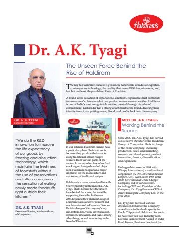 34 %u201cWe do the R&D innovation to improve the life expectancy of our goods by freezing and air-suction technology, which maintains the freshness of foodstuffs without the use of preservatives and offers consumers the sensation of eating newly made foodstuffs right outside their kitchen,%u201d DR. A.K. TYAGIExecutive Director, Haldiram Group of CompaniesThe Unseen Force Behind the Rise of HaldiramDr. A.K. TyagiThe key to Haldiram%u2019s success is genuinely hard work, decades of expertise, contemporary technology, the quality that meets FSSAI requirements, and, last but not least, the punchline: Taste of Tradition.A brand is the collection of expectations, emotions, experiences that contribute to a consumer%u2019s choice to select one product or service over another. Haldiram is one of India%u2019s most recognizable entities, created through decades of commitment. Each leader has a strong attachment to the brand, drawing their identity from it and putting sweat, blood, and profits back into the company.In our kitchen, Haldiram snacks have a particular place. Their success is because they produce their snacks using traditional Indian recipes sourced from various parts of the nation. In an era when few of us find snacking on foreign-branded chips cool, Haldiram has placed a major emphasis on the manufacture and marketing of traditional recipes.Haldiram is a name you%u2019re familiar with. You%u2019ve probably not heard of Dr. A.K. Tyagi. That%u2019s because he%u2019s the unseen force behind the scenes, the invisible supporting the visible. In the year 2006, he joined the Haldiram Group of Companies as Executive President and was later elevated to Executive Director. He is in charge of the company%u2019s top line, bottom line, vision, diversification, expansion, innovation, and R&D, among other things, as well as reporting to the Board of Directors.MEET DR. A.K. TYAGIWorking Behind the ScenesSince 2006, Dr. A.K. Tyagi has served as Executive Director of the Haldiram Group of Companies. He is in charge of the entire company, including production, sales, and marketing, research and development, product innovation, finance, diversification, and expansion. He began his career in 1984 with Wimpy International, a multinational corporation (A Div. of United Biscuit Empire, UK). Later, from 1988 until 2000, he worked at Uncle Chipps Company Ltd in various roles, including CEO and President of the Company. Dr. Tyagi became CEO of Amrit Banaspati Company Ltd. in the year 2000.Dr. Tyagi has received various Awards on behalf of the Company as well as at individual capacity in Uncle Chipps and Haldiram. Recently, he has received Food Industry Icon Lifetime Achievement Award in India Food Forum, Business Leader of the DR. A. K. TYAGIExecutive Director