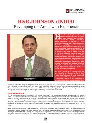 40 H&R JOHNSON (INDIA)Revamping the Arena with Experienceis strongly reflected in the pioneering innovations that include germ-free tiles & sanitary ware, solar reflective tiles, anti-static tiles, tactile for the visually impaired, and many more. The motto is also mirrored in the experience Centers set up across the country, which showcase the variety and available options for varied applications. Their manufacturing locations are strategically located enabling them to have speed and timely delivery services for clients.EDGE OVER OTHERS%u201cIf you continuously compete with others, you become bitter. But if you continuously compete with yourself, you become better,%u201d and that%u2019s exactly what H&R Johnson is doing by relentlessly working on its services to make it even better. At H&R Johnson, quality is a way of life, be it product or service, the company strives to deliver the best quality to its customers and consumers. The management team of the company keeps a strict vigil on every aspect of product quality and ensures stringent adherence norms. Moreover, stringent quality tests are carried out on inbound raw materials such as clays, minerals, chemicals, and pigments that are procured from the large network of vendors and suppliers- both from India and across the globe.Being the leader in the realm, H&R Johnson has a strong retail network of over a thousand dealers and more than 10, 000 sub-dealers- and the number is growing at a brisk pace every single day with a single sole objective to servicing clients across the length and breadth of the country. The company has also partnered and collaborated with almost all leading architects, designers, consultants, developers, and institutions across the country. Backed by a dedicated business development team, H&R Johnson is the pioneer of ceramic tiles in India- that has been providing top-notch products and exemplary services since 1958. Being a division of Prism Johnson Ltd., an integrated and wellestablished building and construction player in the industry, H&R Johnson has over the past six decades introduced innovative products to offer a complete package of solutions to its clientele.H&R Johnson carries a reputation of being the only entity in India to offer endto-end tiling solutions for every space and application, serviced through Johnson Tiles, Johnson Porselano, Johnson Marbonite, and Johnson Endura ranges. Johnson bathrooms offer a set of complete solutions in the bathrooms arena ranging from sanitary ware, faucets, accessories, and wellness products. Also, Johnson Marble & Quartz offers a wide range of products in engineered marble and quartz for various applications.Mr Sarat Chandak (ED & CEO) states that the company has always strived to keep %u2018Innovation%u2019 in all aspects of the business at the forefront. The organization%u2019s mission, %u201cImproving lifestyles of our customers by providing innovative products and services,%u201dSARAT CHANDAKED & CEO