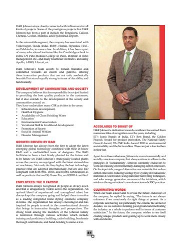 41H&R Johnson stays closely connected with influencers for all kinds of projects. Some of the prestigious projects that H&R Johnson has been a part of include the Bengaluru, Calicut, Chennai, Cochin, Mumbai, and Hyderabad airports.In the automobile segment, the company has associated with Volkswagen, Skoda India, BMW, Honda, Hyundai, FIAT, and Mahindra, to name a few. In addition, it has been a part of many educational institutes like the Cambridge school in Delhi, DY Patil Medical College in Pune, Institute of hotel management, etc., and many healthcare institutes, including Apollo, AIIMS, Lilavati, etc.H&R Johnson%u2019s team asserts to remain thankful and committed towards all clients and patrons, offering them innovative products that are not only aesthetically beautiful but stand equally strong in terms of durability and functionality.DEVELOPMENT OF COMMUNITIES AND SOCIETYThe company believes that its responsibility is not just limited to providing the best quality products to the customers, but it also extends to the development of the society and communities around us.They have undertaken many CSR activities in the areas:%u2022 Infrastructure development,%u2022 Health & Hygiene%u2022 Availability of Clean Drinking Water%u2022 Education%u2022 Environmental Conservation%u2022 Vocational Skill & Livelihood development%u2022 Promotion of Sports%u2022 Social & Animal Welfare%u2022 Disaster ManagementGROWTH DRIVEN BY R&DH&R Johnson has always been the first to adopt the latest emerging global technology combined with their in-house R&D and a multi-skilled team of designers. The R&D facilitates to have a foot firmly planted for the future and to be future set. H&R Johnson%u2019s strategically located plants across the country are equipped with the latest state-of-theart machinery. Not only do they deploy the best technology practices that are adopted internationally, but are also ISO compliant with both 9001, 14001, and 450001 certifications as well as products that are ISI, Green Pro, and GRIHA certified.EMPLOYEES: THE X FACTORH&R Johnson always recognized its people as its key asset, and that is ubiquitously visible across the organization. An optimal blend of experienced and young-bred talent has always kept the company going and helped them to evolve as a leading integrated home-styling solutions company in India. The organization has always encouraged and has inspired its people to work in the cross-functional domain that brings in innovative thoughts and perspectives. The strong bond among the members of the Johnson family is reinforced through various activities which include training and proficiency building, cadre building, bonhomie thorough celebrations, and hand-holding to name a few.ACCOLADES TO BOAST OFH&R Johnson%u2019s dedication towards excellence has earned them numerous titles of recognition over the years, including ET%u2019s Iconic Brands of India, ET%u2019s Best Brand, the Golden Peacock Award for product innovation, The National Safety Council Award, 7th CSR India Award 2020 in environmental sustainability and the list is endless. These are just a few feathers in their hat.Apart from these milestones, Johnson is an environmentally and socially conscious company that always strives to adhere to the principles of %u2018Sustainability%u2019. Johnson constantly endeavors to work on reducing environmentally damaging carbon emissions. On the input side, usage of alternative raw materials that reduce carbon emissions, reducing wastage by re-cycling of residual raw materials & wastewater, using rainwater harvesting techniques, and solar energy generation are some of the initiatives, which reinforce the organizations%u2019 commitment towards ESG practices. CULMINATING WORDS When our team asked Sarat to reveal the future endeavors of the company, he replied by saying, %u201cThe future is not always unknown if we consciously do right things at present. As a corporate and having led particularly the ceramic tile arena for decades, we see ourselves holding good ground and motivating the industry as a whole to perform well in terms of customer satisfaction.%u201d In the future, the company wishes to see itself creating unique products and gearing up to work more closely with end clients.