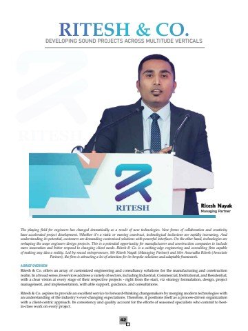 42 The playing field for engineers has changed dramatically as a result of new technologies. New forms of collaboration and creativity have accelerated project development. Whether it%u2019s a static or moving construct, technological inclusions are rapidly increasing. And understanding its potential, customers are demanding customized solutions with powerful interfaces. On the other hand, technologies are reshaping the ways engineers design projects. This is a potential opportunity for manufacturers and construction companies to include more innovation and better respond to changing client needs. Ritesh & Co. is a cutting-edge engineering and consulting firm capable of making any idea a reality. Led by sound entrepreneurs, Mr Ritesh Nayak (Managing Partner) and Mrs Anuradha Ritesh (Associate Partner), the firm is attracting a lot of attention for its bespoke solutions and adaptable framework.A BRIEF OVERVIEWRitesh & Co. offers an array of customized engineering and consultancy solutions for the manufacturing and construction realm. In a broad sense, its services address a variety of sectors, including Industrial, Commercial, Institutional, and Residential, with a clear vision at every stage of their respective projects - right from the start, viz strategy formulation, design, project management, and implementation, with able support, guidance, and consultations. Ritesh & Co. aspires to provide an excellent service to forward-thinking changemakers by merging modern technologies with an understanding of the industry%u2019s ever-changing expectations. Therefore, it positions itself as a process-driven organization with a client-centric approach. Its consistency and quality account for the efforts of seasoned specialists who commit to bestin-class work on every project. RITESH & CO.DEVELOPING SOUND PROJECTS ACROSS MULTITUDE VERTICALSRitesh NayakManaging Partner