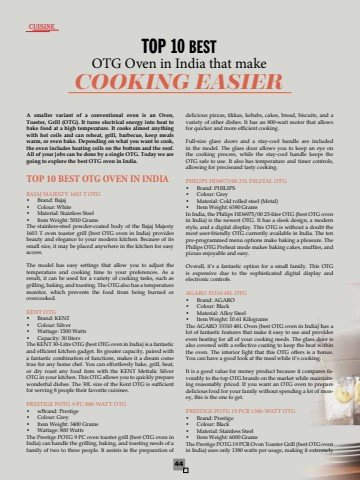 44 TOP 10 BESTCOOKING EASIERA smaller variant of a conventional oven is an Oven, Toaster, Grill (OTG). It turns electrical energy into heat to bake food at a high temperature. It cooks almost anything with hot coils and can reheat, grill, barbecue, keep meals warm, or even bake. Depending on what you want to cook, the oven includes heating coils on the bottom and the roof. All of your jobs can be done by a single OTG. Today we are going to explore the best OTG oven in India.TOP 10 BEST OTG OVEN IN INDIABAJAJ MAJESTY 1603 T OTG%u2022 Brand: Bajaj%u2022 Colour: White%u2022 Material: Stainless Steel%u2022 Item Weight: 5010 GramsThe stainless-steel powder-coated body of the Bajaj Majesty 1603 T oven toaster grill (best OTG oven in India) provides beauty and elegance to your modern kitchen. Because of its small size, it may be placed anywhere in the kitchen for easy access.The model has easy settings that allow you to adjust the temperature and cooking time to your preferences. As a result, it can be used for a variety of cooking tasks, such as grilling, baking, and toasting. The OTG also has a temperature monitor, which prevents the food from being burned or overcooked.KENT OTG%u2022 Brand: KENT%u2022 Colour: Silver%u2022 Wattage: 1500 Watts%u2022 Capacity: 30 litersThe KENT 30-Litre OTG (best OTG oven in India) is a fantastic and efficient kitchen gadget. Its greater capacity, paired with a fantastic combination of functions, makes it a dream come true for any home chef. You can effortlessly bake, grill, heat, or dry roast any food item with the KENT Mettalic Silver OTG in your kitchen. This OTG allows you to quickly prepare wonderful dishes. The 30L size of the Kent OTG is sufficient for serving 8 people their favorite cuisines.PRESTIGE POTG 9 PC 800-WATT OTG%u2022 wBrand: Prestige%u2022 Colour: Grey%u2022 Item Weight: 3400 Grams%u2022 Wattage: 800 WattsThe Prestige POTG 9 PC oven toaster grill (best OTG oven in India) can handle the grilling, baking, and toasting needs of a family of two to three people. It assists in the preparation of delicious pizzas, tikkas, kebabs, cakes, bread, biscuits, and a variety of other dishes. It has an 800-watt motor that allows for quicker and more efficient cooking.Full-size glass doors and a stay-cool handle are included in the model. The glass door allows you to keep an eye on the cooking process, while the stay-cool handle keeps the OTG safe to use. It also has temperature and timer controls, allowing for preciseand tasty cooking.PHILIPS HD6975/00 25L DIGITAL OTG%u2022 Brand: PHILIPS%u2022 Colour: Grey%u2022 Material: Cold rolled steel (Metal)%u2022 Item Weight: 6380 GramsIn India, the Philips HD6975/00 25-liter OTG (best OTG oven in India) is the newest OTG. It has a sleek design, a modern style, and a digital display. This OTG is without a doubt the most user-friendly OTG currently available in India. The ten pre-programmed menu options make baking a pleasure. The Philips OTG Preheat mode makes baking cakes, muffins, and pizzas enjoyable and easy.Overall, it%u2019s a fantastic option for a small family. This OTG is expensive due to the sophisticated digital display and electronic controls.AGARO 33310 48L OTG%u2022 Brand: AGARO%u2022 Colour: Black%u2022 Material: Alloy Steel%u2022 Item Weight: 10.61 KilogramsThe AGARO 33310 48L Oven (best OTG oven in India) has a lot of fantastic features that make it easy to use and provides even heating for all of your cooking needs. The glass door is also covered with a reflective coating to keep the heat within the oven. The interior light that this OTG offers is a bonus. You can have a good look at the meal while it%u2019s cooking.It is a good value for money product because it compares favorably to the top OTG brands on the market while maintaining reasonably priced. If you want an OTG oven to prepare delicious food for your family without spending a lot of money, this is the one to get.PRESTIGE POTG 19 PCR 1380-WATT OTG%u2022 Brand: Prestige%u2022 Colour: Black%u2022 Material: Stainless Steel%u2022 Item Weight: 6000 GramsThe Prestige POTG 19 PCR Oven Toaster Grill (best OTG oven in India) uses only 1380 watts per usage, making it extremely OTG Oven in India that makeCuisine44