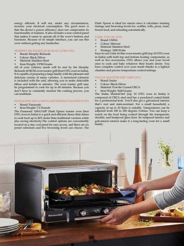 45energy efficient. It will not, under any circumstances, increase your electrical consumption. The good news is that the device%u2019s power efficiency does not compromise its functionality or features. It also includes a new control panel that makes it easier to operate all of the oven%u2019s buttons and functions. Because of its simple interface, you can use this oven without getting any headaches.MORPHY RICHARDS 60 RCSS 60-LITRE OTG%u2022 Brand: Morphy Richards%u2022 Colour: Black/Silver%u2022 Material: Stainless Steel%u2022 Item Weight: 13780 GramsAll of your culinary needs will be met by the Morphy Richards 60 RCSS oven toaster grill (best OTG oven in India). It is capable of preparing a large family with the pleasant and delicious cuisine of many varieties. A motorized rotisserie is included with the unit, allowing you to make delectable tikkas and kebabs in minutes. The oven toaster grill may be programmed to cook for up to 60 minutes. Because you don%u2019t have to constantly monitor the cooking process, you can multitask.PANASONIC NB-G110P FLASH XPRESS TOASTER OVEN%u2022 Brand: Panasonic%u2022 Item Weight: 7.5 PoundsThe Panasonic NB-G110P Flash Xpress toaster oven (best OTG oven in India) is a quick and efficient choice that claims to cook food up to 40% faster than traditional versions while also saving electricity.The control options are conveniently located on a stay cool panel for easy access, and there are six preset selections and five browning levels can choose. The Flash Xpress is ideal for snacks since it calculates toasting timings and browning levels for, waffles, rolls, pizza, toast, frozen food, and reheating automatically.USHA 3716 16L OTG%u2022 Brand: USHA%u2022 Colour: Maroon%u2022 Material: Stainless Steel%u2022 Wattage: 1200 WattsEasy-to-use Usha 16-liter oven-toaster grill (top 10 OTG oven in India) with both top and bottom heating components, as well as five accessories, OTG allows you and your loved ones to cook and bake whatever their hearts desire. You have complete control over your meals thanks to a lighted chamber and precise temperature control settings.INALSA MASTERCHEF 16BK OTG%u2022 Brand: Inalsa%u2022 Colour: Black/Silver%u2022 Material: Powder Coated CRCA%u2022 Item Weight: 3600 GramsThe Inalsa MasterChef (top 10 OTG oven in India) is composed of CRCA steel and has a powdered coated finish for a professional look. You%u2019ll also get a galvanized interior that%u2019s rust and stain-resistant. For a small household, a capacity of up to 10 liters is suitable. Temperatures can be adjusted from 100 to 250 degrees Celsius. You can keep a watch on the food being cooked through the transparent, durable, and heatproof glass door. Its rustproof interior and galvanized exterior make it a long-lasting oven for a small family.45