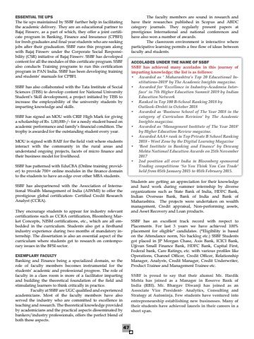 47ESSENTIAL TIE UPS The tie ups maintained by SSBF further help in facilitating the academic delivery. They are an educational partner to Bajaj Finserv, as a part of which, they offer a joint certificate program in Banking, Finance and Insurance (CPBFI) for fresh graduates and final year students who are seeking jobs after their graduation. SSBF runs this program along with Bajaj Finserv under the Corporate Social Responsibility (CSR) initiative of Bajaj Finserv. SSBF has developed content for all the modules of this certificate program. SSBF also conducts Training programs to run this certification program in PAN India. SSBF has been developing training and students%u2019 manuals for CPBFI. SSBF has also collaborated with the Tata Institute of Social Sciences (TISS) to develop content for National University Student%u2019s Skill development, a project initiated by TISS to increase the employability of the university students by imparting knowledge and skills. SSBF has signed an MOU with CRIF High Mark for giving a scholarship of Rs. 1,00,000-/- for a needy student based on academic performance and family%u2019s financial condition. The trophy is awarded for the outstanding student every year.MOU is signed with BAIF for the field visit where students interact with the community in the rural areas and understand ongoing projects, facets of micro finance and their business model for livelihood. SSBF has patterned with EduCBA (Online training provider) to provide 700+ online modules in the finance domain to the students to have an edge over other MBA students.SSBF has alsopartnered with the Association of International Wealth Management of India (AIWMI) to offer the prestigious global certification- Certified Credit Research Analyst (CCRA).They encourage students to appear for industry relevant certifications such as CCRA certification, Bloomberg Market Concepts, NISM certifications, etc., which are all embedded in the curriculum. Students also get a firsthand industry experience during two months of mandatory internship. The dissertation is also an essential aspect of the curriculum where students get to research on contemporary issues in the BFSI sector. EXEMPLARY FACULTY Banking and Finance being a specialized domain, so the role of faculty members becomes instrumental for the students%u2019 academic and professional progress. The role of faculty in a class room is more of a facilitator imparting and building the theoretical foundation of the field and stimulating learners to think critically in practice. Faculty at SSBF are UGC qualified and experienced academicians. Most of the faculty members have also served the industry who are committed to excellence in teaching and research. The theoretical knowledge provided by academicians and the practical aspects disseminated by bankers/industry professionals, offers the perfect blend of both these aspects. The faculty members are sound in research and have their researches published in Scopus and ABDC category journals. They regularly present papers at prestigious International and national conferences and have also won a number of awards.The classroom environment is interactive where participative learning permits a free flow of ideas between faculty and students.ACCOLADES UNDER THE NAME OF SSBFSSBF has achieved many accolades in this journey of imparting knowledge; the list is as follows:%u2022 Awarded as %u2018 Maharashtra%u2019s Top 20 Educational Institutions-2019%u2019 by The Academic Insights magazine.%u2022 Awarded for %u2018Excellence in Industry-Academia Interface%u2019 in 7th Higher Education Summit 2019 by Indian Education Network%u2022 Ranked in Top 100 B-School Ranking 2018 by Outlook-Drshti in October 2018%u2022 Awarded as %u2018Business School of The Year 2018 in the category of Curriculum Revision%u2019 by The Academic Insights magazine.%u2022 Awarded as %u2018Management Institute of The Year 2018%u2019 by Higher Education Review magazine.%u2022 Awarded AAA+ rank in Top Private B School Ranking 2018 - West Zone by the Digital Learning Magazine%u2022 %u2018Best Institute in Banking and Finance%u2019 by Dewang Mehta National Education Awards on 25th November 2017%u2022 2nd position all over India in Bloomberg sponsored Trading competitions %u2018So You Think You Can Trade%u2019 held from 05th January 2015 to 05th February 2015.Students are getting an appreciation for their knowledge and hard work during summer internship by diverse organizations such as State Bank of India, HDFC Bank, Indian Overseas Bank, Bank of India and Bank of Maharashtra. The projects were undertaken on wealth management, Credit appraisal, Non-performing assets, and Asset Recovery and Loan products.SSBF has an excellent track record with respect to Placements. For last 3 years we have achieved 100% placement for eligible* candidates. (*Eligibility is based on the Attendance norm, No backlog etc.) SSBF Students got placed in JP Morgan Chase, Axis Bank, ICICI Bank, Ujjivan Small Finance Bank, HDFC Bank, Capital First, Federal bank, Care Ratings, etc. with various profiles like Operations, Channel Officer, Credit Officer, Relationship Manager, Analysts, Credit Manager, Credit Underwriter, Product Trainee and Management Trainee etc.SSBF is proud to say that their alumni Mr. Hardik Mehta has joined as a Manager in Reserve Bank of India (RBI). Mr. Bhargav Diwanji has joined as an Associate Vice President- Analytics, Consulting and Strategy at Autoninja. Few students have ventured into entrepreneurship establishing new businesses. Many of their students have achieved laurels in their careers in a short span.
