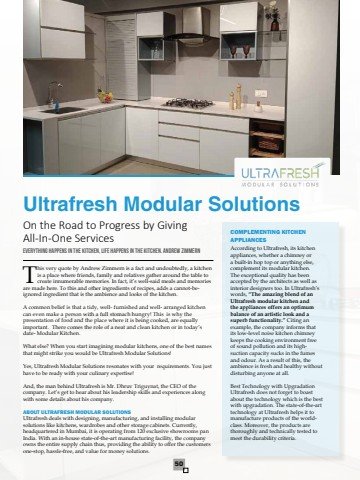 50 This very quote by Andrew Zimmern is a fact and undoubtedly, a kitchen is a place where friends, family and relatives gather around the table to create innumerable memories. In fact, it%u2019s well-said meals and memories are made here. To this and other ingredients of recipes, adds a cannot-beignored ingredient that is the ambience and looks of the kitchen.A common belief is that a tidy, well- furnished and well- arranged kitchen can even make a person with a full stomach hungry! This is why the presentation of food and the place where it is being cooked, are equally important. There comes the role of a neat and clean kitchen or in today%u2019s date- Modular Kitchen.What else? When you start imagining modular kitchens, one of the best names that might strike you would be Ultrafresh Modular Solutions!Yes, Ultrafresh Modular Solutions resonates with your requirements. You just have to be ready with your culinary expertise!And, the man behind Ultrafresh is Mr. Dhruv Triguynat, the CEO of the company. Let%u2019s get to hear about his leadership skills and experiences along with some details about his company.ABOUT ULTRAFRESH MODULAR SOLUTIONSUltrafresh deals with designing, manufacturing, and installing modular solutions like kitchens, wardrobes and other storage cabinets. Currently, headquartered in Mumbai, it is operating from 120 exclusive showrooms pan India. With an in-house state-of-the-art manufacturing facility, the company owns the entire supply chain thus, providing the ability to offer the customers one-stop, hassle-free, and value for money solutions.Ultrafresh Modular SolutionsOn the Road to Progress by Giving All-In-One ServicesEverything happens in the kitchen, life happens in the kitchen. Andrew ZimmernCOMPLEMENTING KITCHEN APPLIANCESAccording to Ultrafresh, its kitchen appliances, whether a chimney or a built-in hop top or anything else, complement its modular kitchen. The exceptional quality has been accepted by the architects as well as interior designers too. In Ultrafresh%u2019s words, %u201cThe amazing blend of an Ultrafresh modular kitchen and the appliances offers an optimum balance of an artistic look and a superb functionality.%u201d Citing an example, the company informs that its low-level noise kitchen chimney keeps the cooking environment free of sound pollution and its highsuction capacity sucks in the fumes and odour. As a result of this, the ambience is fresh and healthy without disturbing anyone at all. Best Technology with UpgradationUltrafresh does not forget to boast about the technology which is the best with upgradation. The state-of-the-art technology at Ultrafresh helps it to manufacture products of the worldclass. Moreover, the products are thoroughly and technically tested to meet the durability criteria.